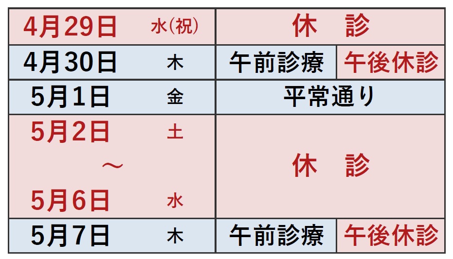 ゴールデンウイーク期間の休診日は下記の通りとさせていただきます。